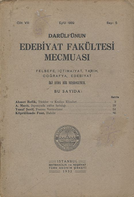 Darülfünun Edebiyat Fakültesi Mecmuası Beşinci sene Sayı 1-2 Haziran - Kânun-ı Evvel 1926