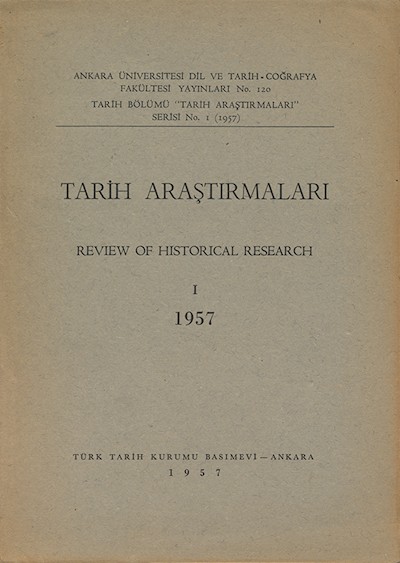 1957 Tarih Araştırmaları I 1957 sayfa YAZAR - MAKALESayfa Afet İNAN Dil Ve Tarih - Coğrafya Fakültesinin Kuruluş Hazırlıkları Üzerine1-16 B. SPULER Bemerkungen zur Gegenwartslage der Deutschen Orıentalıstık17-24 Hans FREYER Über Die Sozıalgeschıchte Des XIX. Und XX. Jahrhunderts ( Zugleıch Eıne Kritik Der Marx'schen Sozıologıe)25-38 Hans FREYER XIX. Ve XX. Yüzyılların Sosyal Tarihi Üzerine (Aynı Zamanda Marx Sosyolojisinin Bir Tenkidi) (Terc. Yaşar Önen)39-51 M. SWEARINGEN X. The Amerıcan Revolutıon - An Interpretatıon53-67 M. SWEARINGEN Amerikan İhtilâline Blr Bakış (Terc. Halil İnalcık)69-82 R. M. HATTON Charles XII in Turkey - "Narratıve Of The Kıng Of Sweden's Movements 1709-1714 (?):" A Robert Samber Translatıon Identıfıed83-101 R. M. HATTON "Narratıve Of The Kıng Of Sweden's Movements 1709-1714 (?):" A Robert Samber Translatıon Identıfıed103-105 Vesikalar Vesikalar : Ankara Dîl Ve Tarih - Coğrafya Fakültesinin Kurulmasına Dair Kanun Lâyihası Ve Maarif Ve Bütçe Encümenleri Mazbataları (1/224)147-150 Toplam 1 fasikül