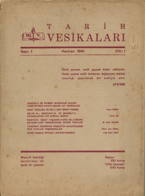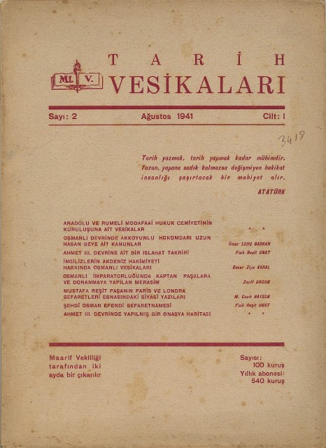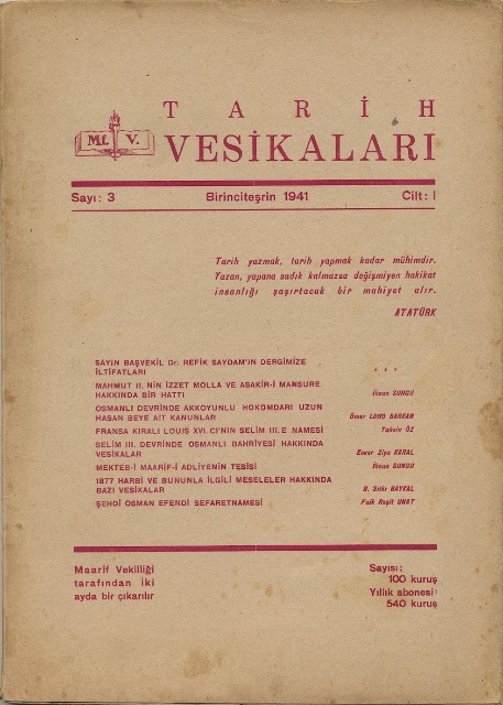 Tarih Vesikaları Cilt I Sayı 3 Birinciteşrin 1941