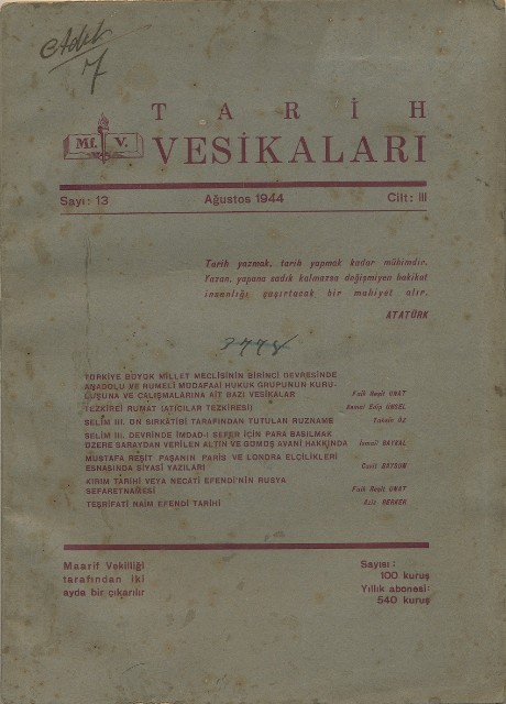 Tarih Vesikaları Cilt III Sayı 13 Ağustos 1944