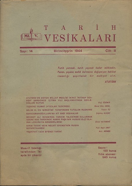 Tarih Vesikaları Cilt III Sayı 14 Birinciteşrin 1944