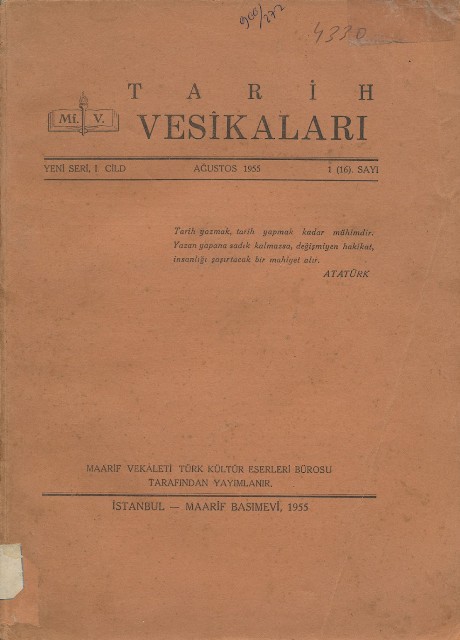 Tarih Vesikaları Yeni Seri, I. Cild 1 (16). Sayı Ağustos 1955
