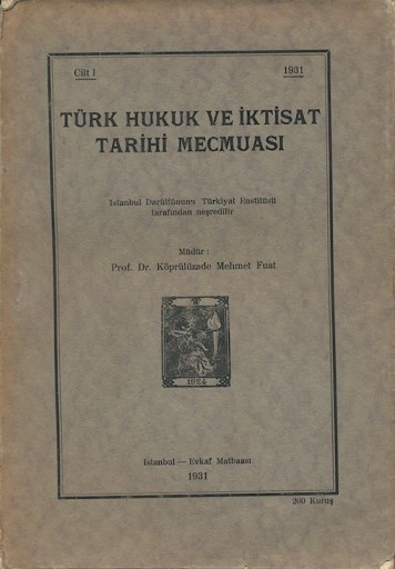 1931 Türk Hukuk ve İktisat Tarihi MecmuasıCilt: 1 1931 344 sayfa YAZAR - MAKALESayfa Ahmet-Zeki Validi Moğollar Devrinde Anadolu'nun İktisadi Vaziyeti1-42 Ciro Truhelka; çeviren Köprülüzade Ahmet Cemal Bosna'da Arazi Meselesinin Tarihî Esasları43-69 Hâmit Sadi Paşaeli: Şarkî Trakya'nın Coğrafyasına ve İktisadî Tarihine Dair Notlar71-104 A. Caferoğlu Tukyu ve Uygurlarda Han Ünvanları105-119 Abdülkadir “Orun” ve “Ülüş” Meselesi121-133 W. Barthold; çeviren Abdülkadir B İlhanlılar Devrinde Malî Vaziyet135-159 P. Wittek Ankara'da Bir İlhanî Kitabesi161-164 Köprülüzade Mehmet Fuat Bizans Müesseselerinin Osmanlı Müesseselerine Te'siri Hakkında Bazı Mülâhazalar165-298 2 Türk Hukuk ve İktisat Tarihi MecmuasıCilt: II 1932 - 391939 Türk Hukuk ve İktisat Tarihi MecmuasıCilt: II 1932 - 39 1939 194 sayfa YAZAR - MAKALESayfa Fuad Köprülü Proto-Bulgar Hukukuna Dair Notlar1-6 Şerefeddin Yaltkaya İlhaniler Devri İdari Teşkilatına Dair: Nasîr-ed-Dini Tûsî’nin Bir Eseri7-16 Fuad Köprülü Eski Türk Unvanlarına Ait Notlar17-31 Fuad Köprülü Ortazaman Türk Devletlerinde Hukukî Senbollerdeki Motifler33-52 A. N. Samoiloviç Cucu Ulusu’nda Payza ve Baysa'ya Dair: Ahmet Han’ın Basması Meselesi53-64 Hasan Ortekin Basma'ya ve Baysa'ya Dair65-71 A. Caferoğlu Türk Taamül Hukukunda Evlatlık Müessesesi97-118 Ömer Barkan Türk-İslâm Toprak Hukuku Tatbikatının Osmanlı İmparatorluğunda Aldığı Şekiller I: Mâlikâne-Divânî Sistemi119-184 Branislav Djurdjev Eflak Kanunu Hakkında Küçük Bir İzah185-187 Toplam 2 fasikül