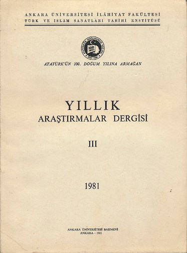Yıllık Araştırmalar Dergisi III 1981 220 sayfa YAZAR - MAKALESayfa Neşet ÇAĞATAY Ord. Prof. Suut Kemal Yetkin (1903-1980)5-7 Sabahattin TEOMAN "Büyük tedirgin" Suut Kemal Yetkin için8-12 Hikmet DİZDAROĞLU Suut Kemal Yetkin'in ardından13-16 İbrahim Agah ÇUBUKÇU Ord. Prof. Suut Kemal Yetkin'le bir söyleşi17-19 Neşet ÇAĞATAY Sivrihisar'ın Mülk Köyü'ndeki Doğan Arslan Mescidi21-39 Gönül ÖNEY İran ve Anadolu Selçuklu Türbelerinin mukayesesi41-66 Beyhan KARAMAĞARALI Ahlat'ta bulunan bir çini fırını67-94 Orhan TUNÇER Cizre Ulu Camii ve Medresesi95-136 Haluk KARAMAĞARALI Erzurum Ulu Camii137-177 Beyhan KARAMAĞARALI Muhammed Siyah Kalem imzalı minyatürler hakkında179-220 Toplam 3 fasikül